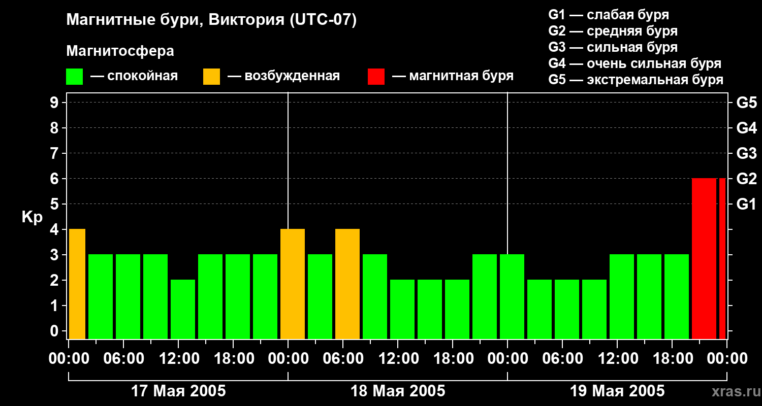 Изменения геомагнитного индекса Kp с 17 по 19 мая 2005 года для средних широт