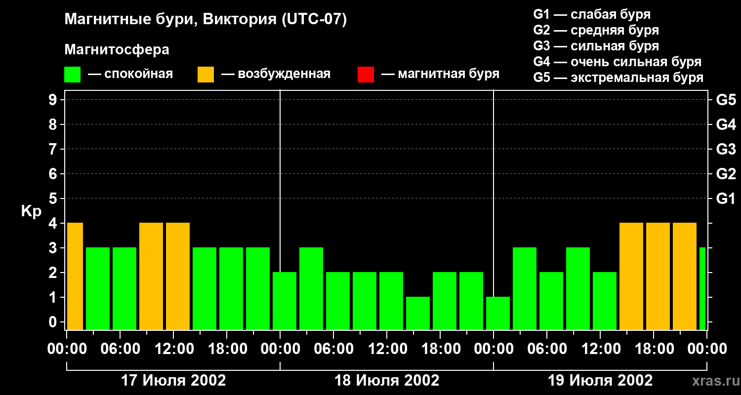 Изменения геомагнитного индекса Kp с 17 по 19 июля 2002 года для средних широт