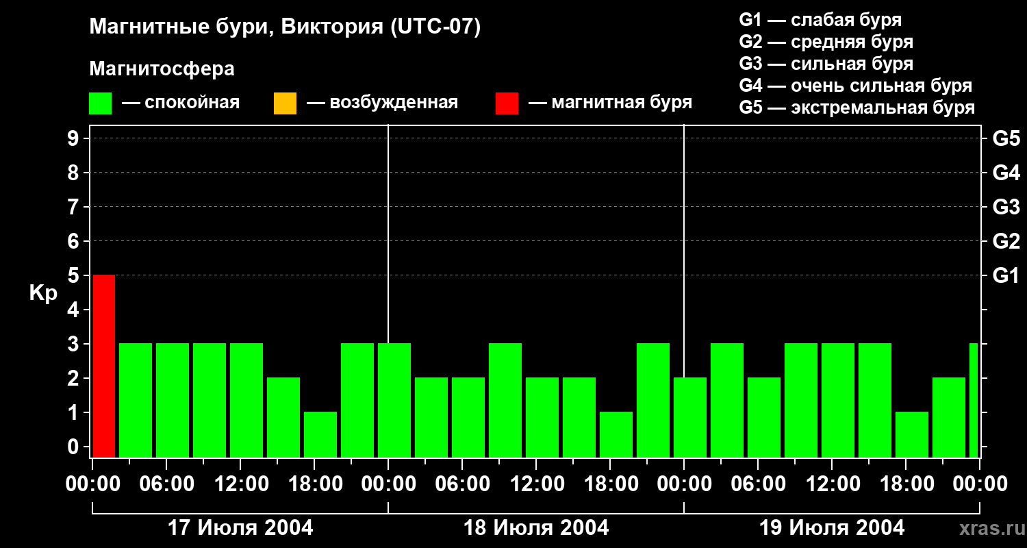 Изменения геомагнитного индекса Kp с 17 по 19 июля 2004 года для средних широт