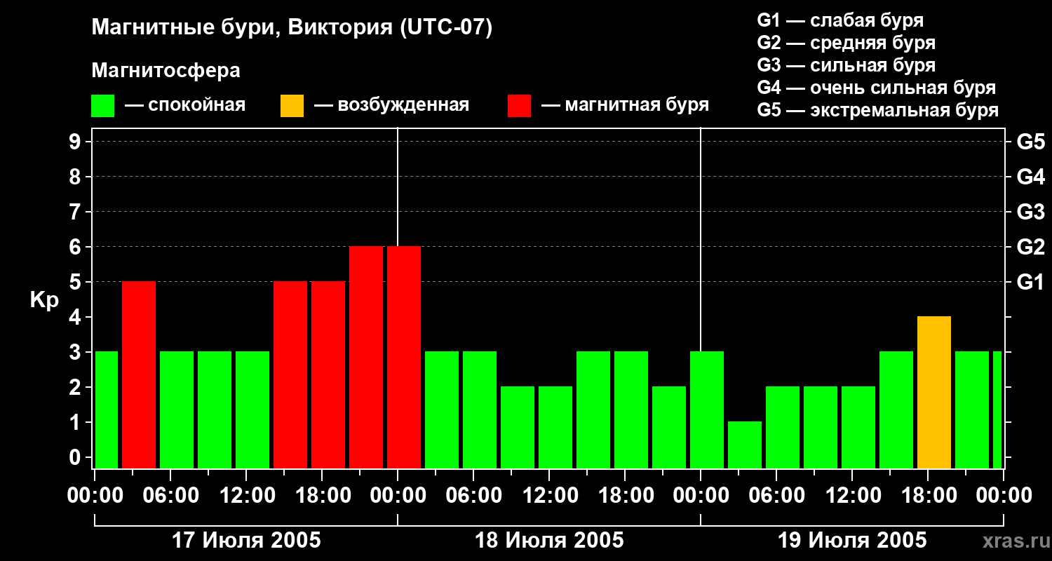 Изменения геомагнитного индекса Kp с 17 по 19 июля 2005 года для средних широт