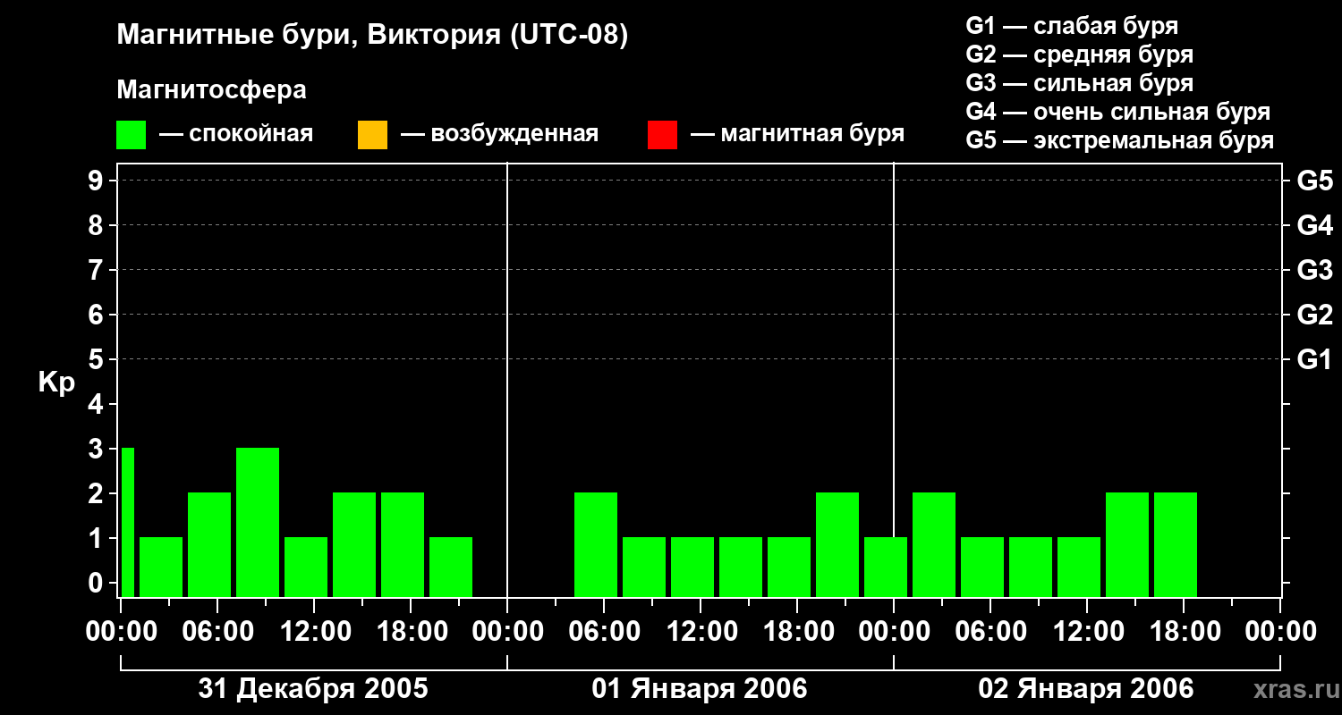 Изменения геомагнитного индекса Kp с 31 декабря 2005 года по 2 января 2006 года для средних широт