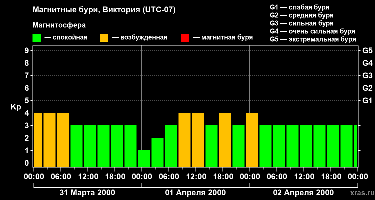 Изменения геомагнитного индекса Kp с 31 марта по 2 апреля 2000 года для средних широт