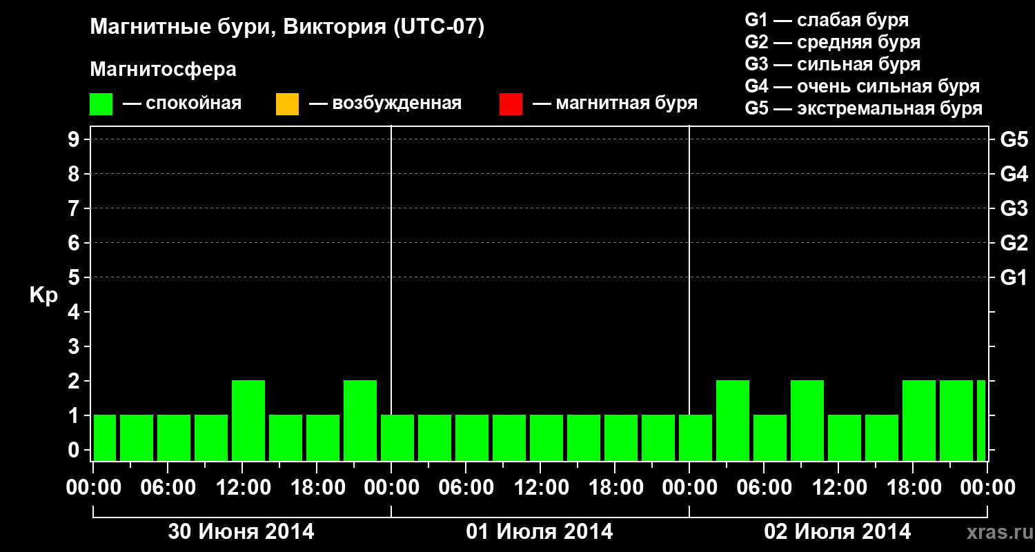 Изменения геомагнитного индекса Kp с 30 июня по 2 июля 2014 года для средних широт