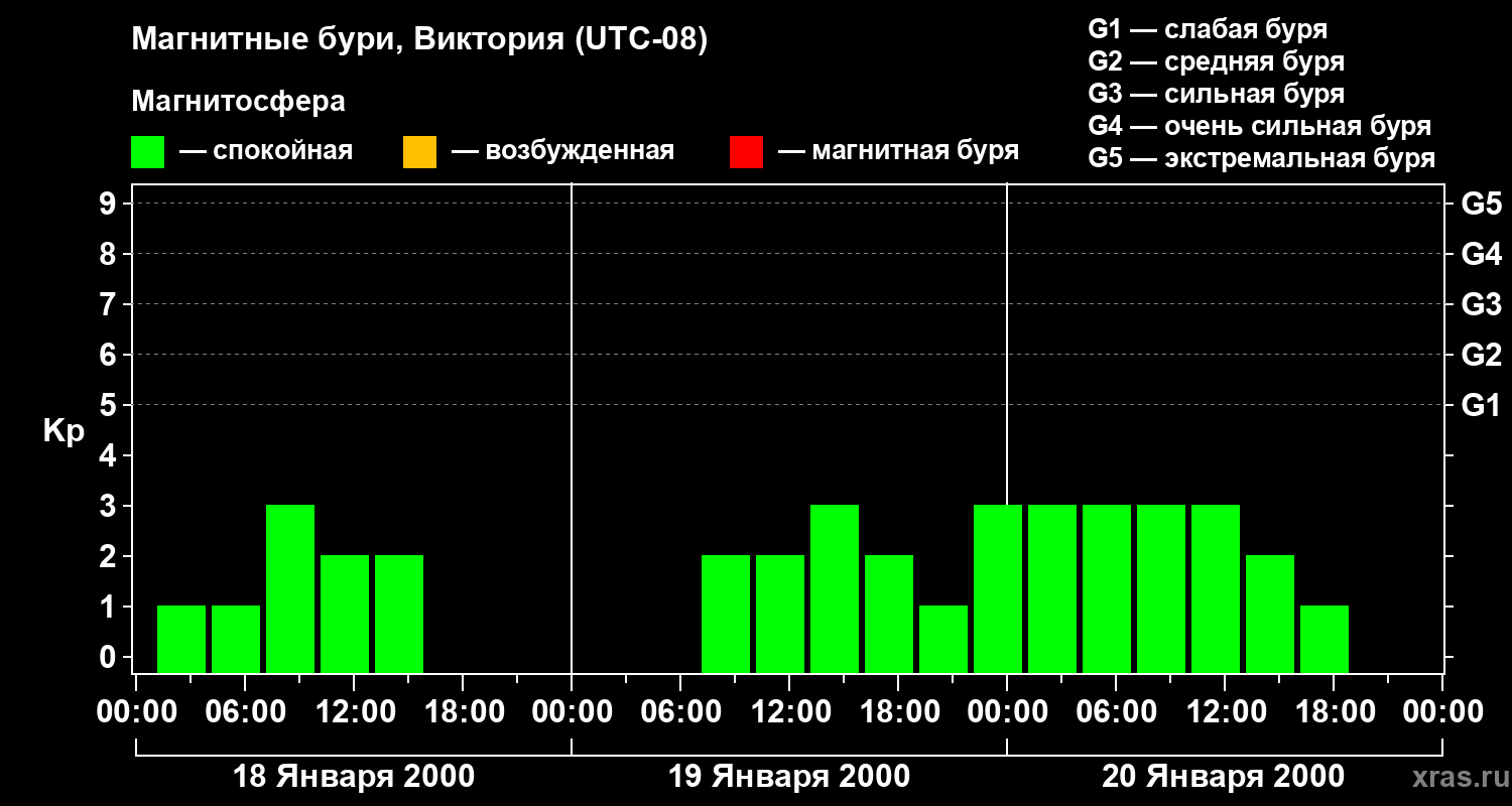 Изменения геомагнитного индекса Kp с 18 по 20 января 2000 года для средних широт