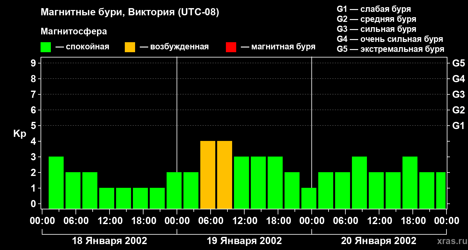 Изменения геомагнитного индекса Kp с 18 по 20 января 2002 года для средних широт