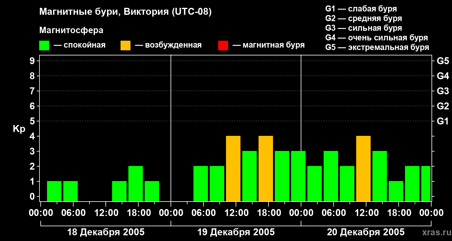 Изменения геомагнитного индекса Kp с 18 по 20 декабря 2005 года для средних широт
