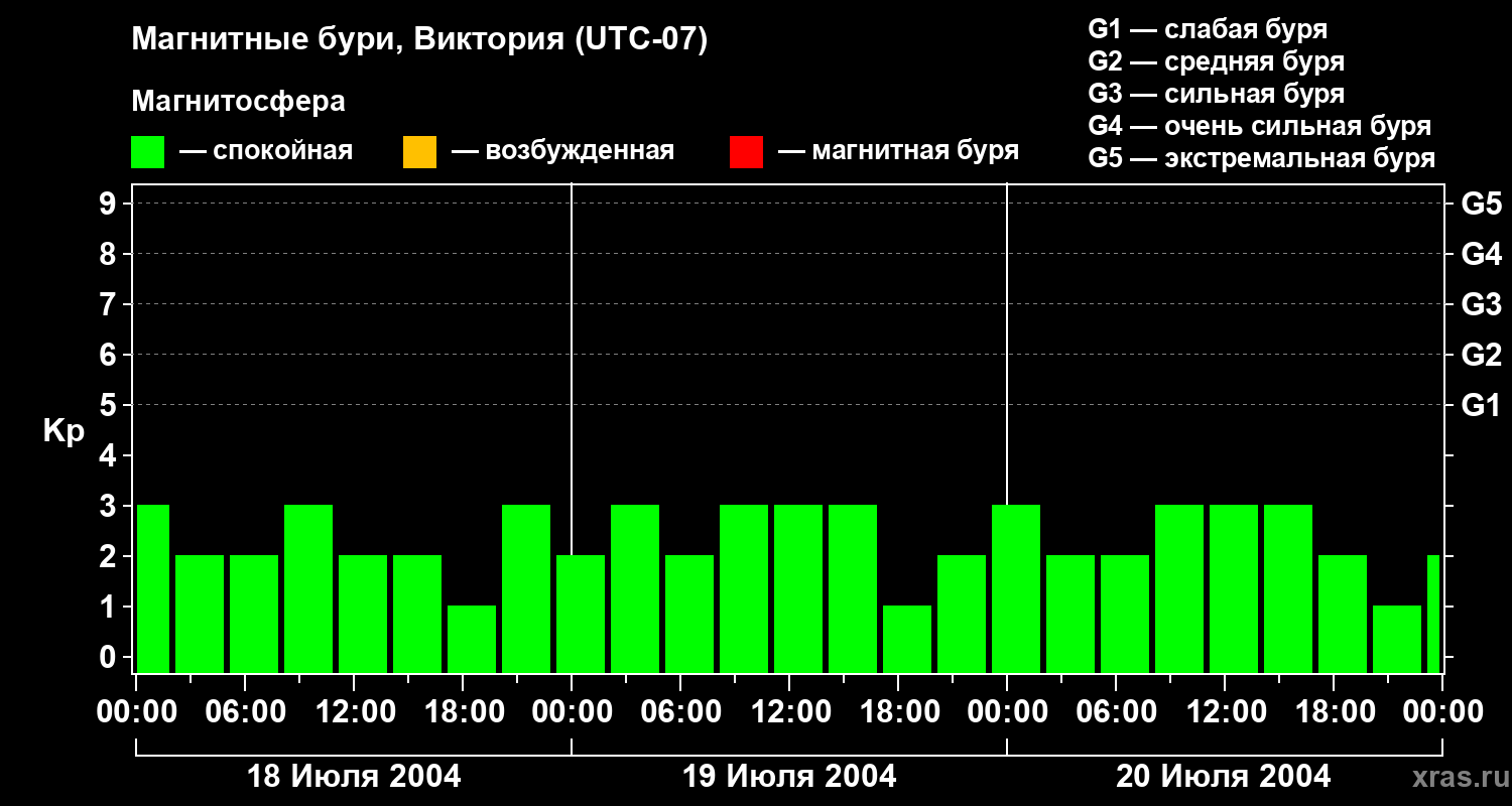 Изменения геомагнитного индекса Kp с 18 по 20 июля 2004 года для средних широт