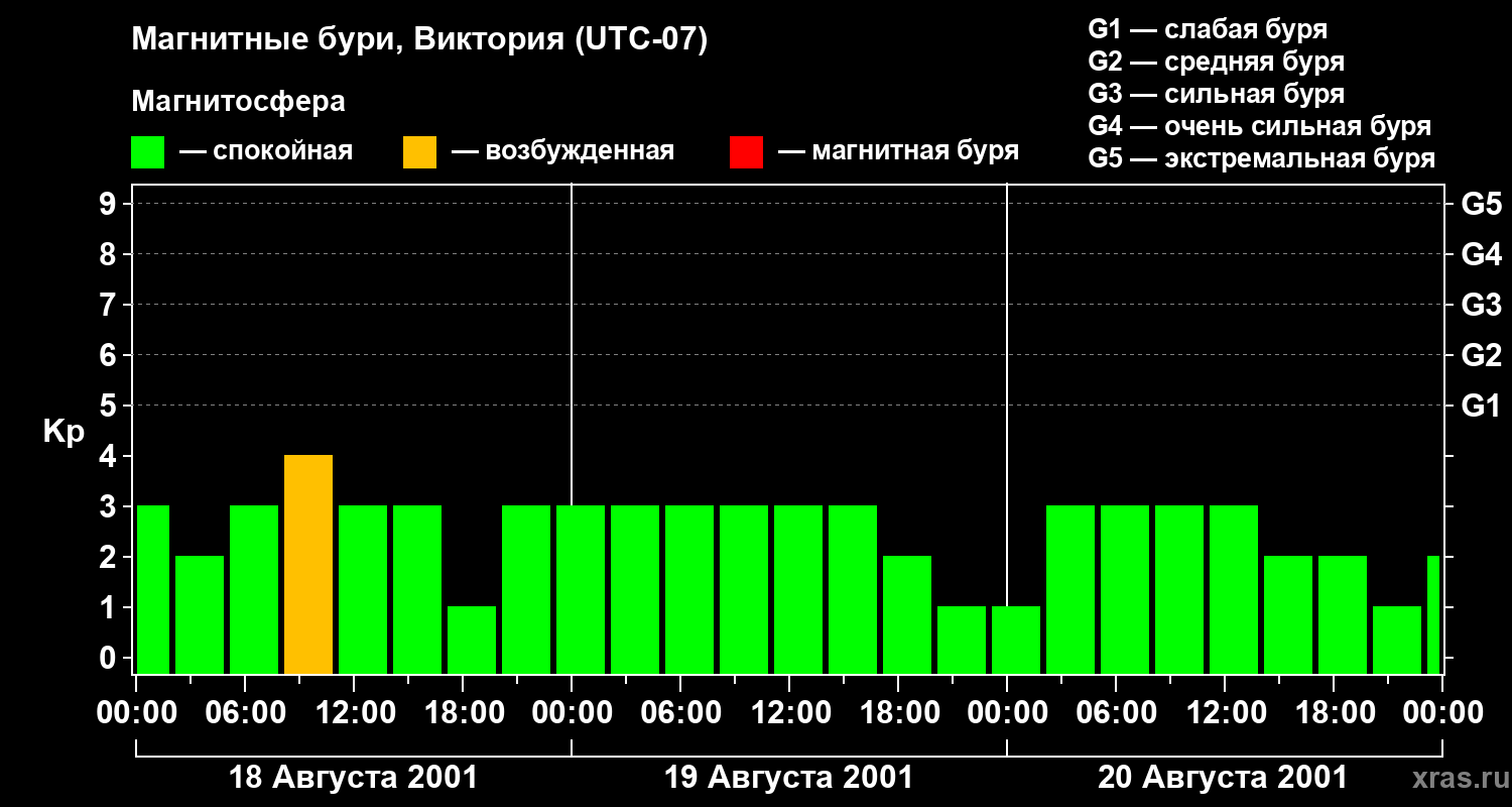 Изменения геомагнитного индекса Kp с 18 по 20 августа 2001 года для средних широт