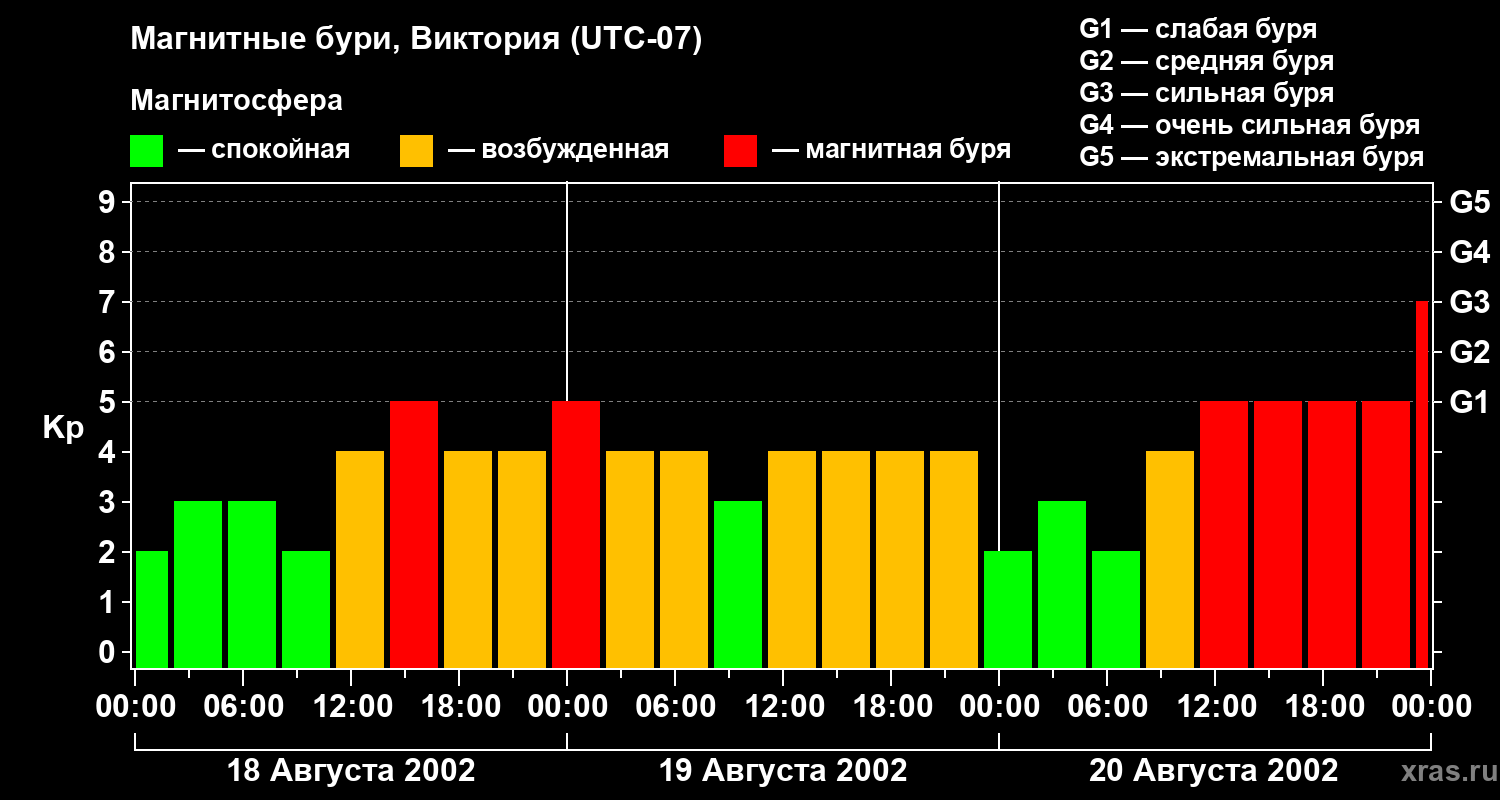 Изменения геомагнитного индекса Kp с 18 по 20 августа 2002 года для средних широт