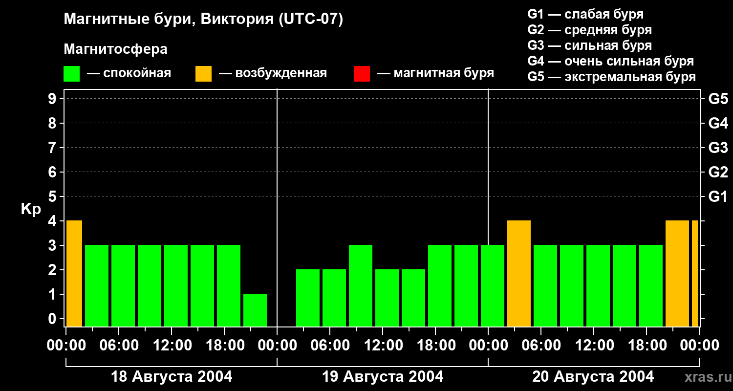 Изменения геомагнитного индекса Kp с 18 по 20 августа 2004 года для средних широт