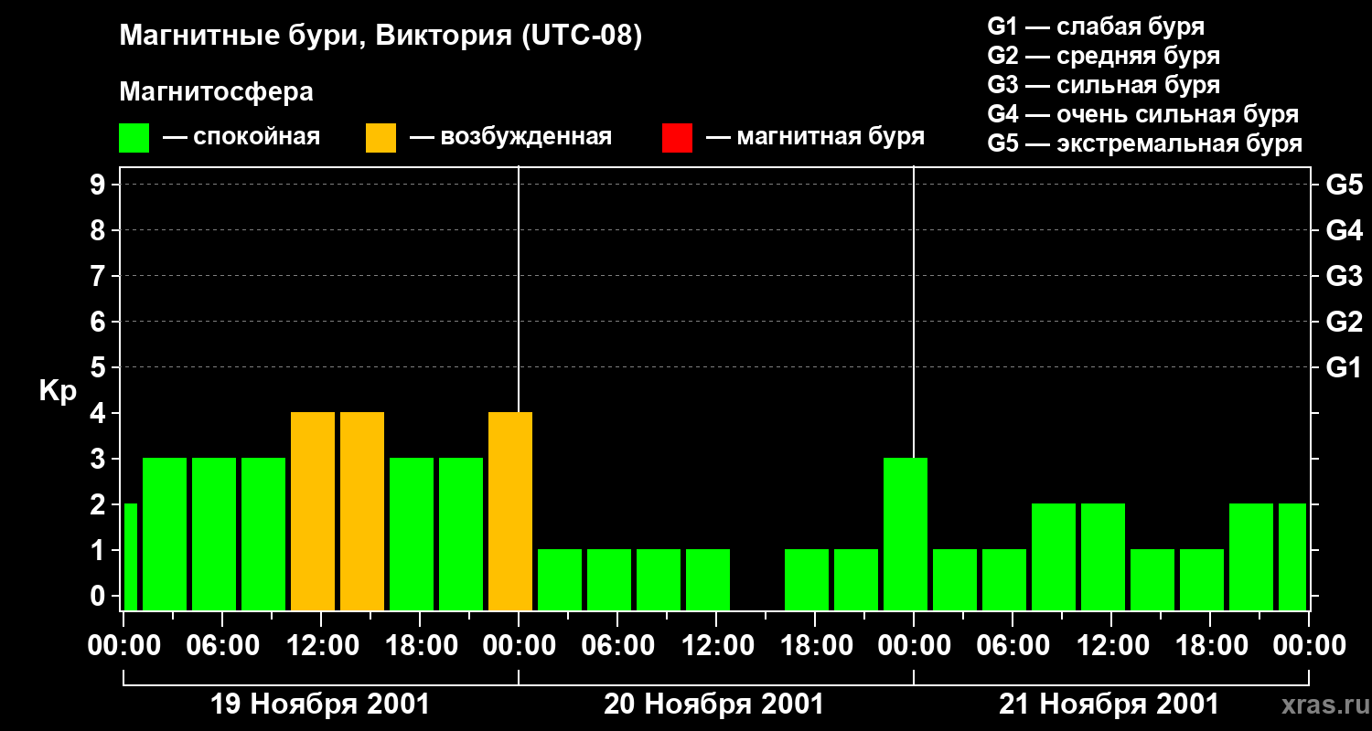 Изменения геомагнитного индекса Kp с 19 по 21 ноября 2001 года для средних широт