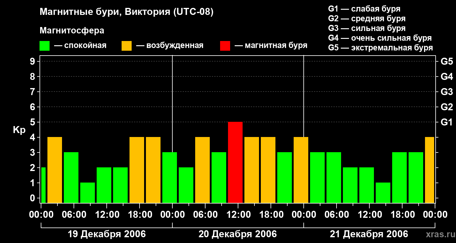 Изменения геомагнитного индекса Kp с 19 по 21 декабря 2006 года для средних широт
