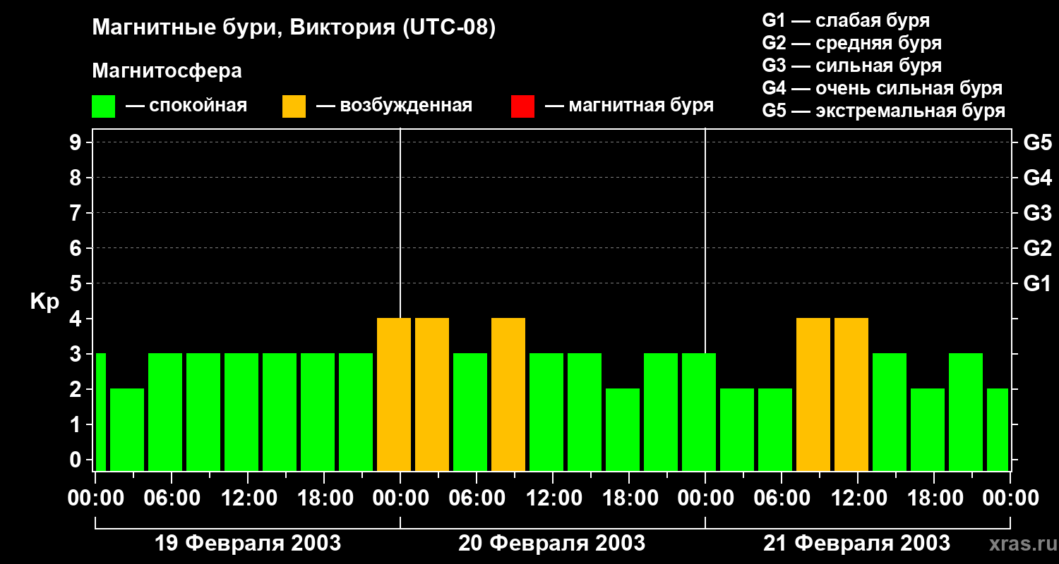 Изменения геомагнитного индекса Kp с 19 по 21 февраля 2003 года для средних широт