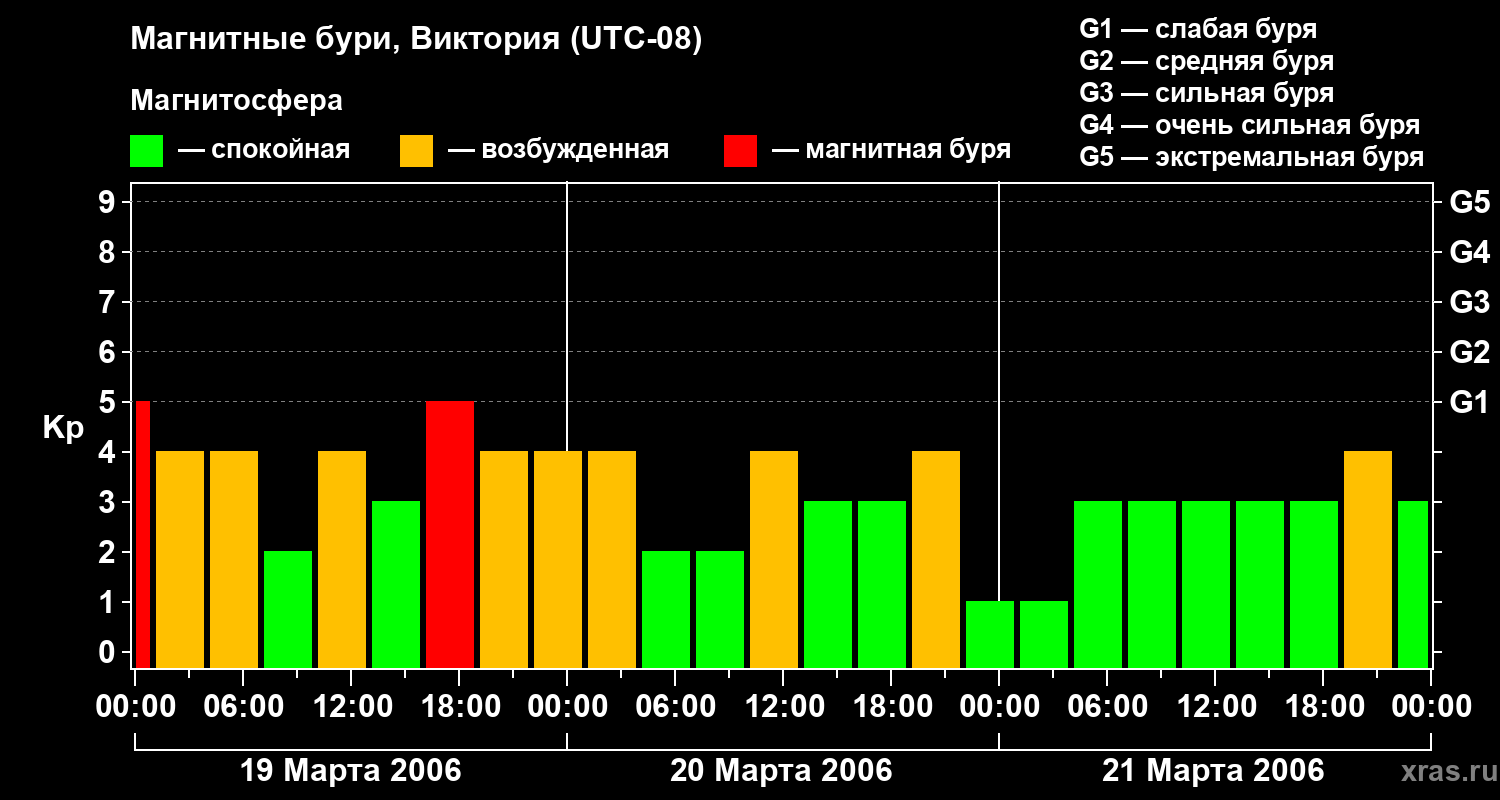 Изменения геомагнитного индекса Kp с 19 по 21 марта 2006 года для средних широт