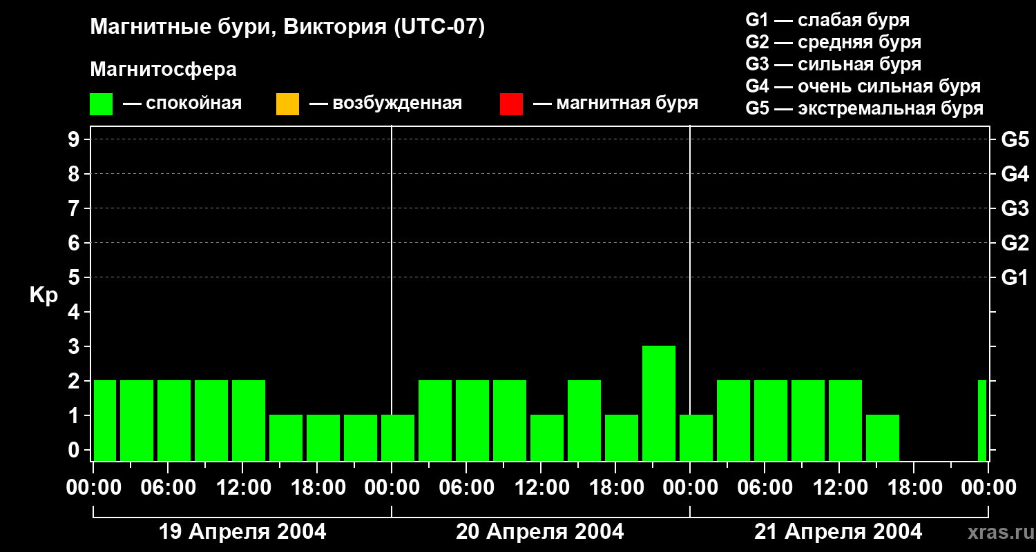 Изменения геомагнитного индекса Kp с 19 по 21 апреля 2004 года для средних широт