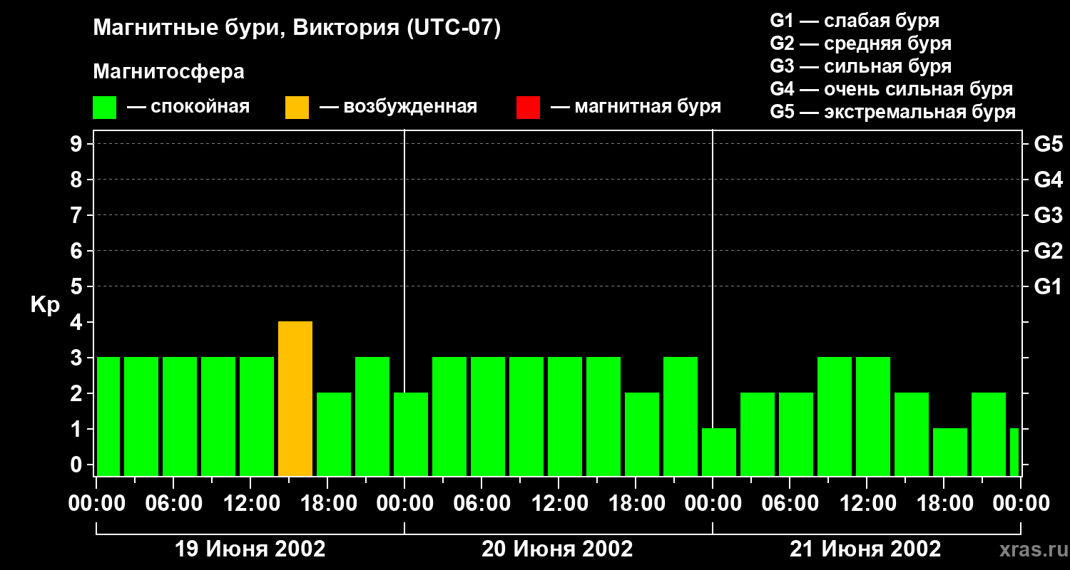 Изменения геомагнитного индекса Kp с 19 по 21 июня 2002 года для средних широт