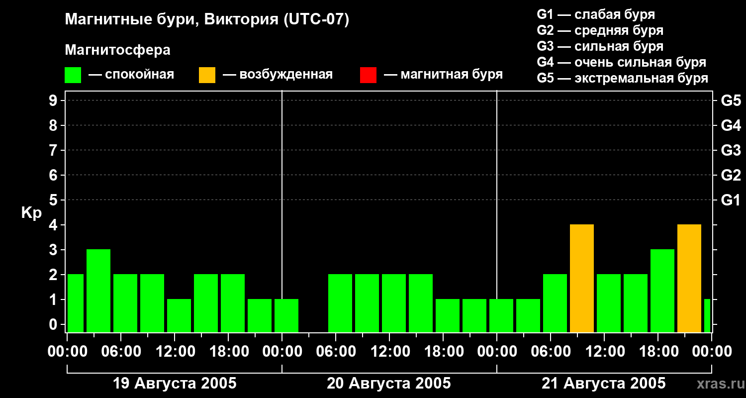 Изменения геомагнитного индекса Kp с 19 по 21 августа 2005 года для средних широт