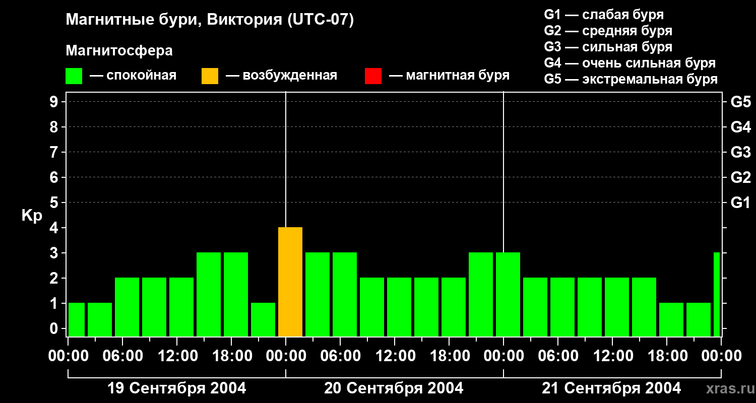 Изменения геомагнитного индекса Kp с 19 по 21 сентября 2004 года для средних широт