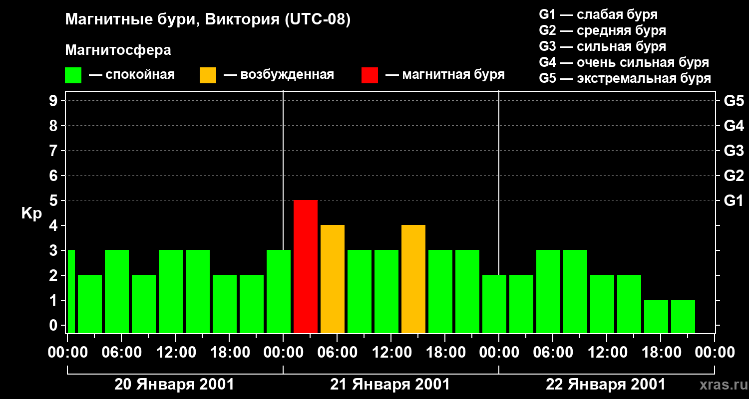 Изменения геомагнитного индекса Kp с 20 по 22 января 2001 года для средних широт