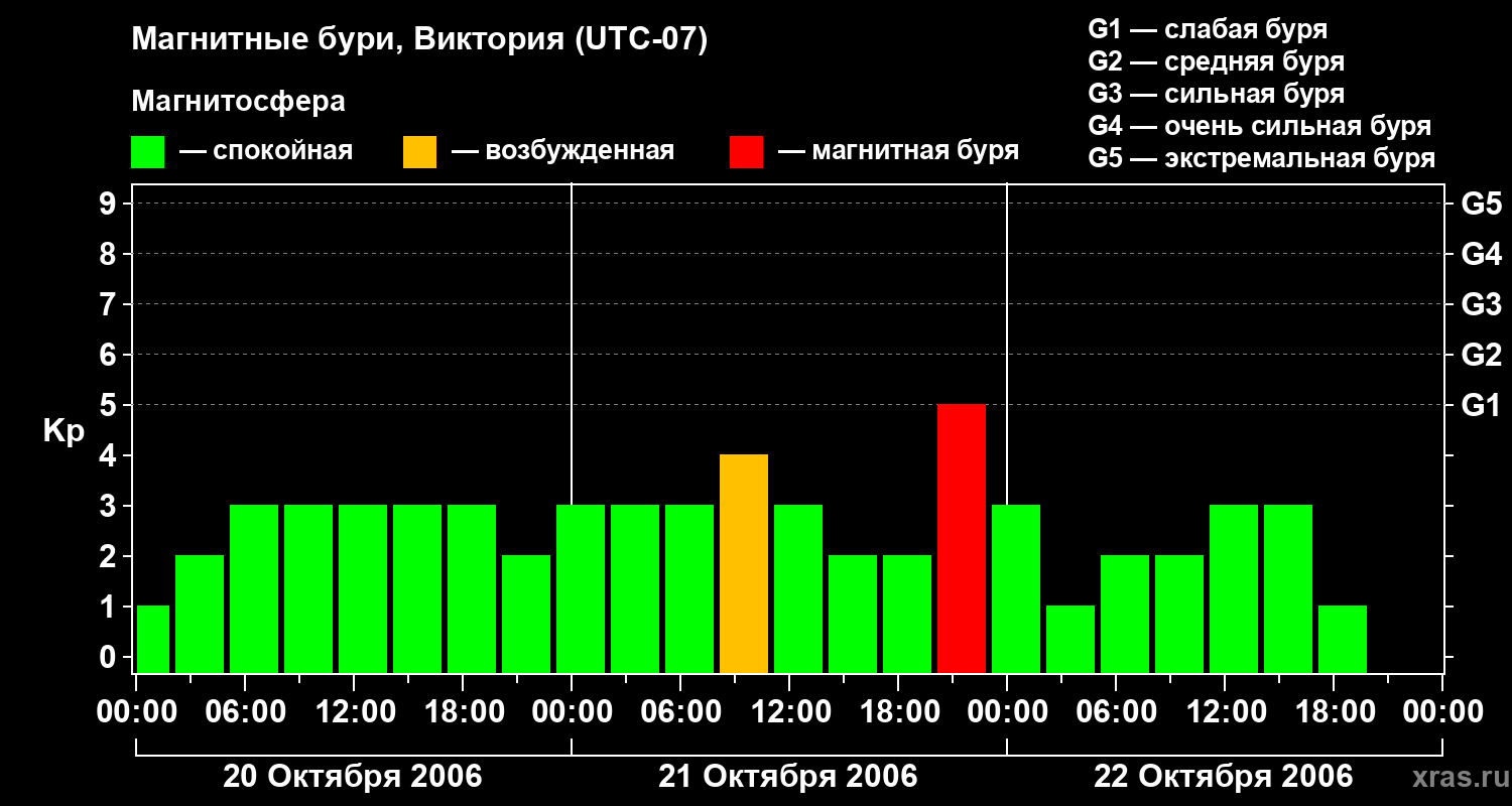 Изменения геомагнитного индекса Kp с 20 по 22 октября 2006 года для средних широт