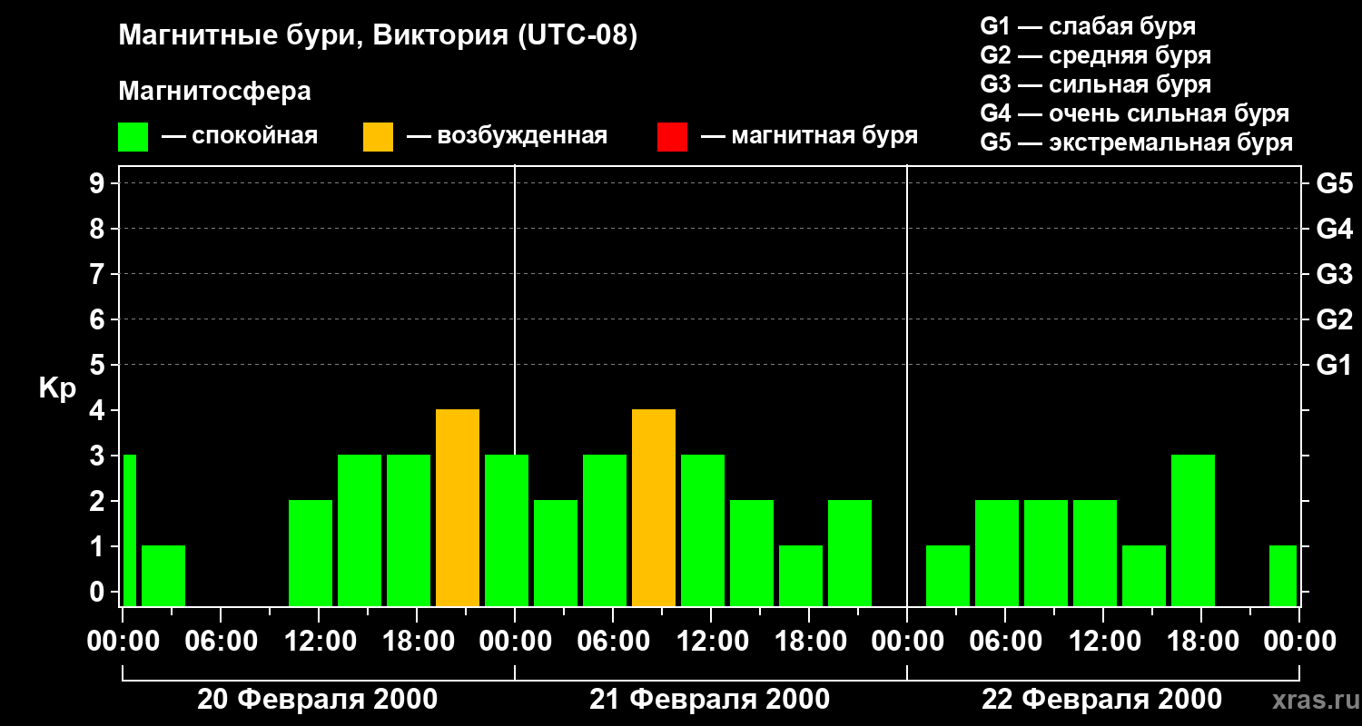 Изменения геомагнитного индекса Kp с 20 по 22 февраля 2000 года для средних широт