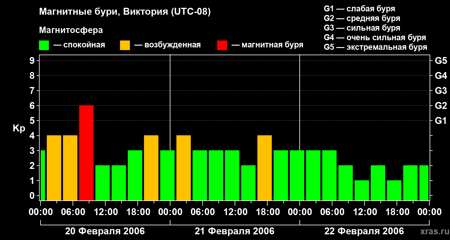 Изменения геомагнитного индекса Kp с 20 по 22 февраля 2006 года для средних широт