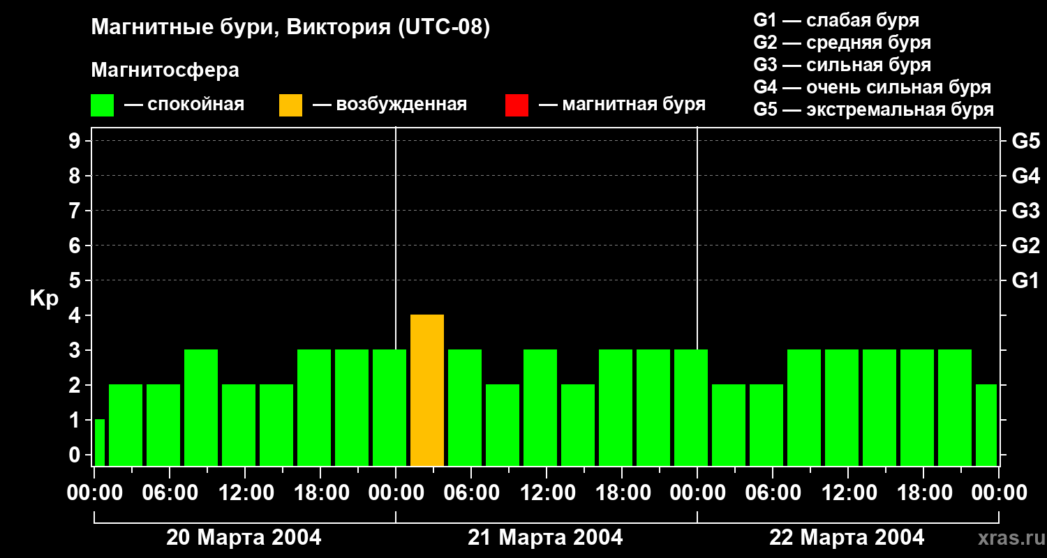 Изменения геомагнитного индекса Kp с 20 по 22 марта 2004 года для средних широт