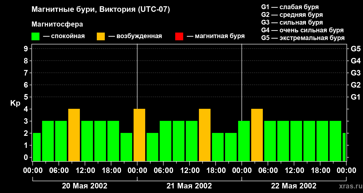 Изменения геомагнитного индекса Kp с 20 по 22 мая 2002 года для средних широт