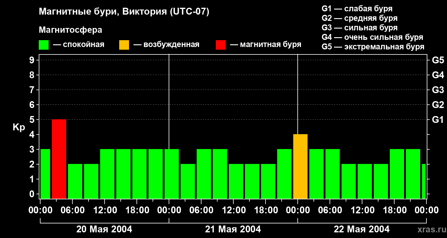 Изменения геомагнитного индекса Kp с 20 по 22 мая 2004 года для средних широт