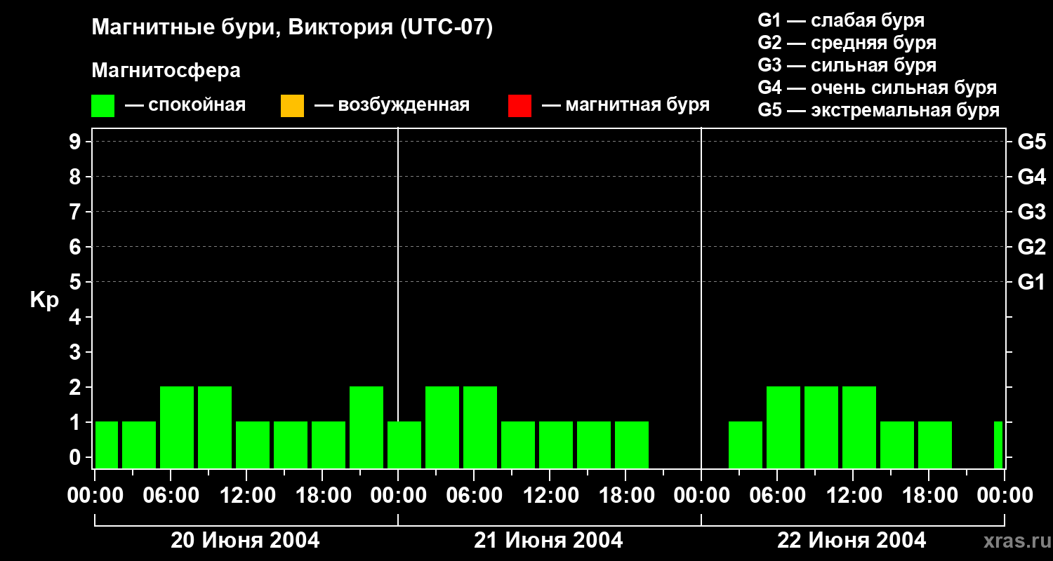 Изменения геомагнитного индекса Kp с 20 по 22 июня 2004 года для средних широт