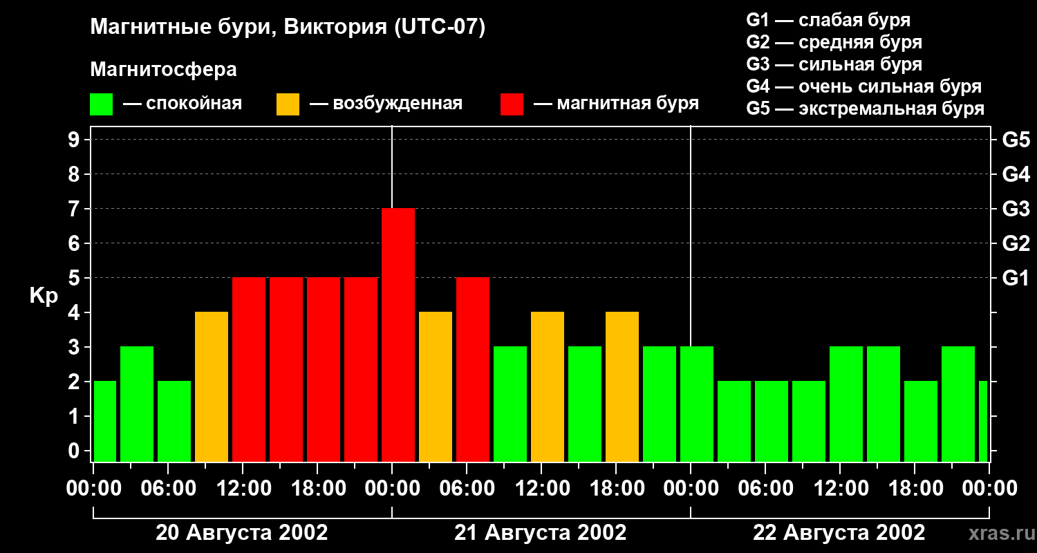 Изменения геомагнитного индекса Kp с 20 по 22 августа 2002 года для средних широт