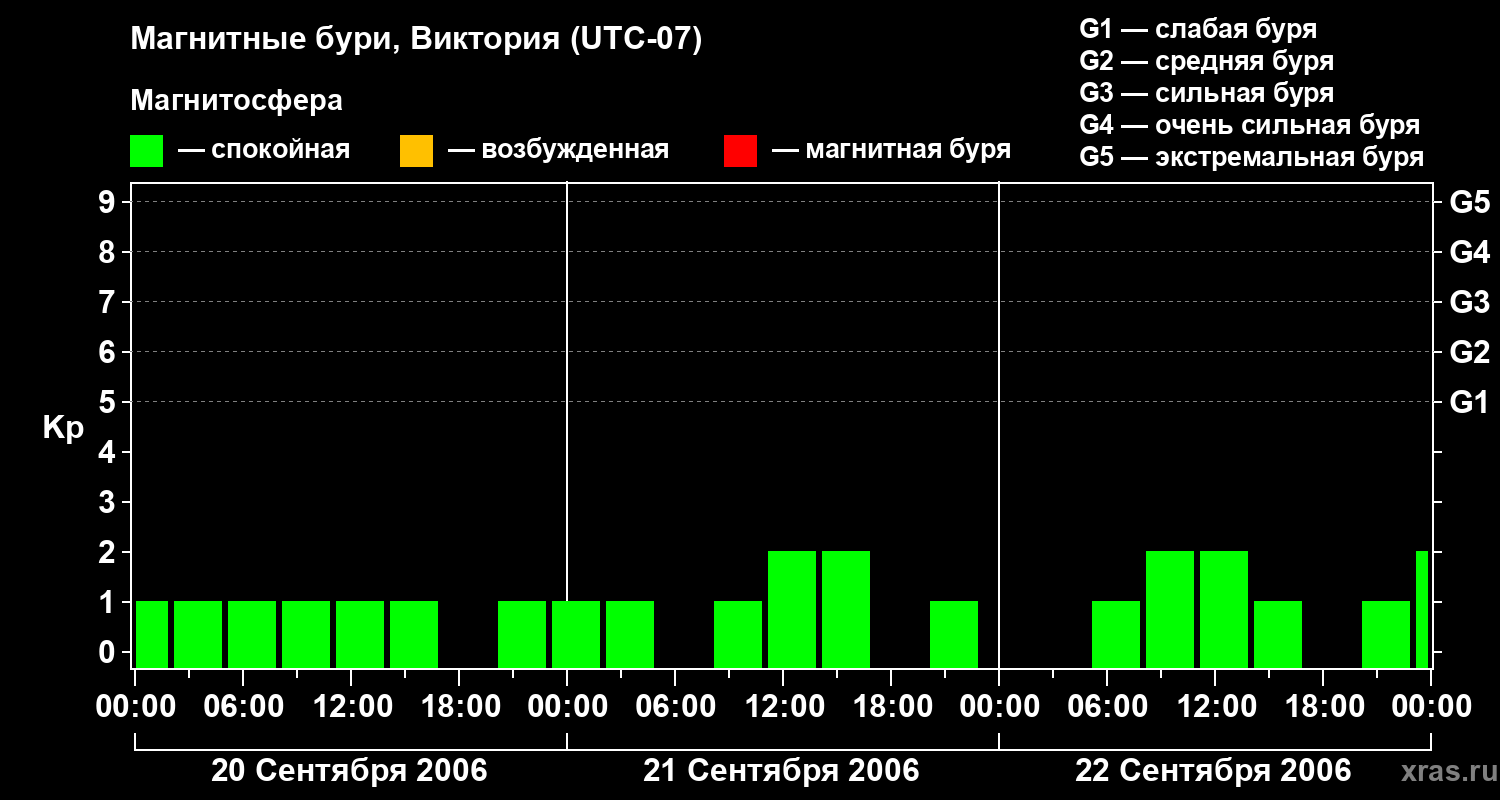 Изменения геомагнитного индекса Kp с 20 по 22 сентября 2006 года для средних широт