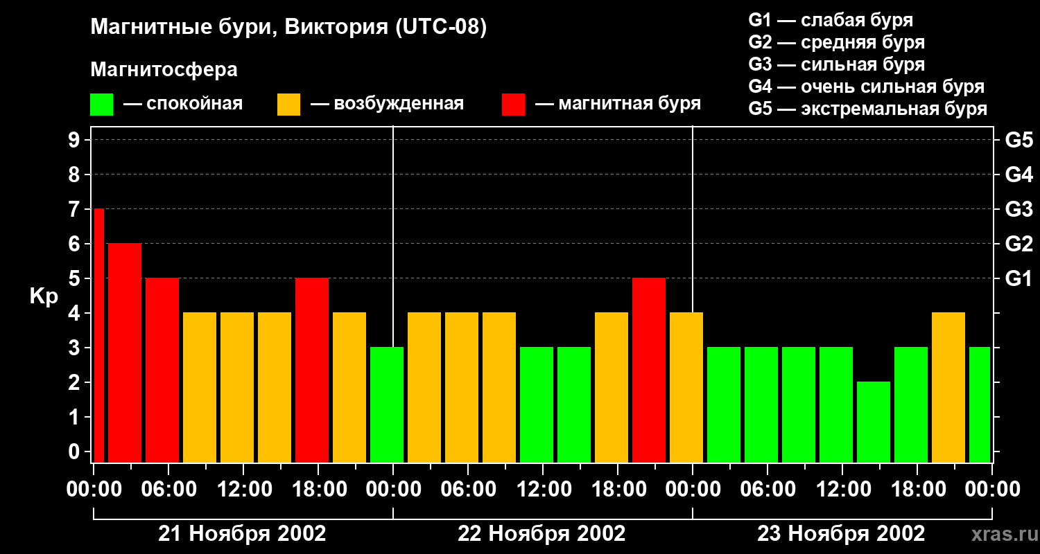 Изменения геомагнитного индекса Kp с 21 по 23 ноября 2002 года для средних широт