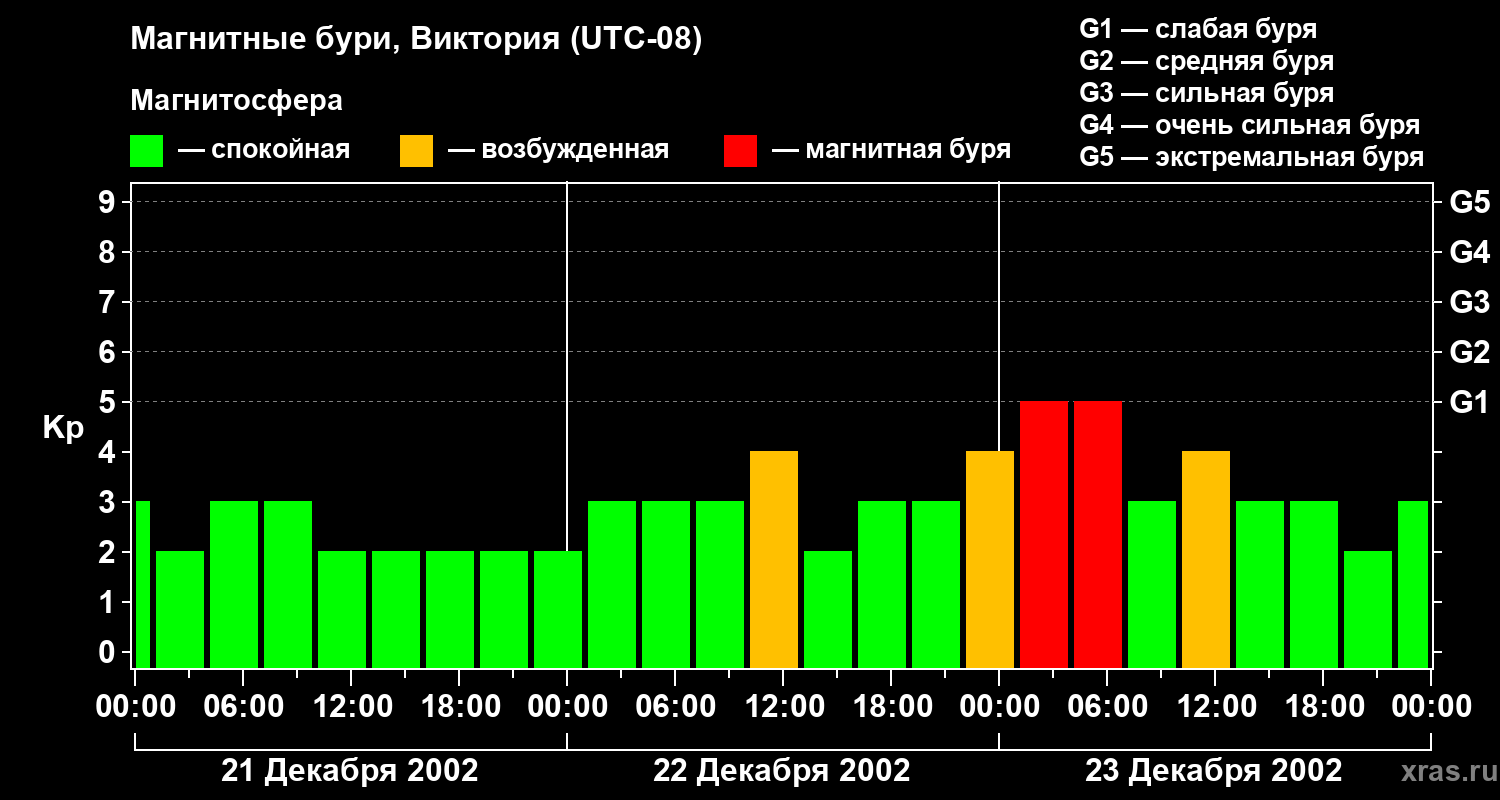 Изменения геомагнитного индекса Kp с 21 по 23 декабря 2002 года для средних широт