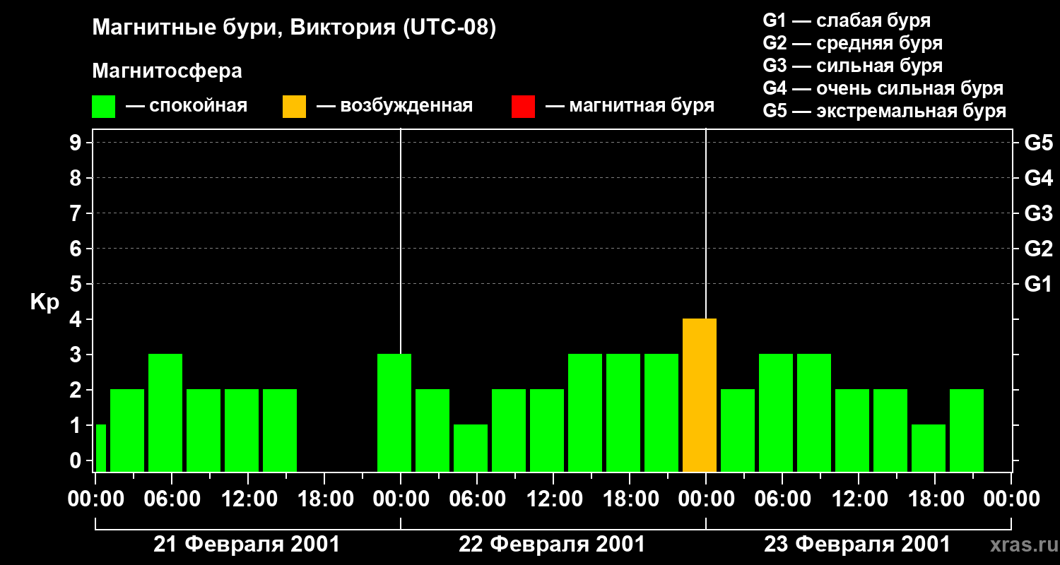 Изменения геомагнитного индекса Kp с 21 по 23 февраля 2001 года для средних широт