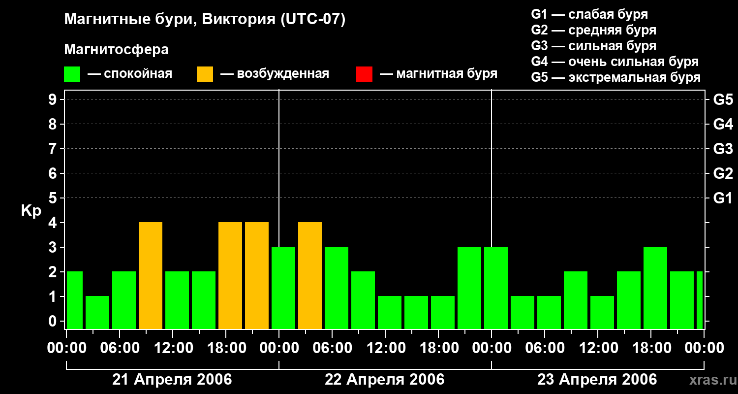 Изменения геомагнитного индекса Kp с 21 по 23 апреля 2006 года для средних широт