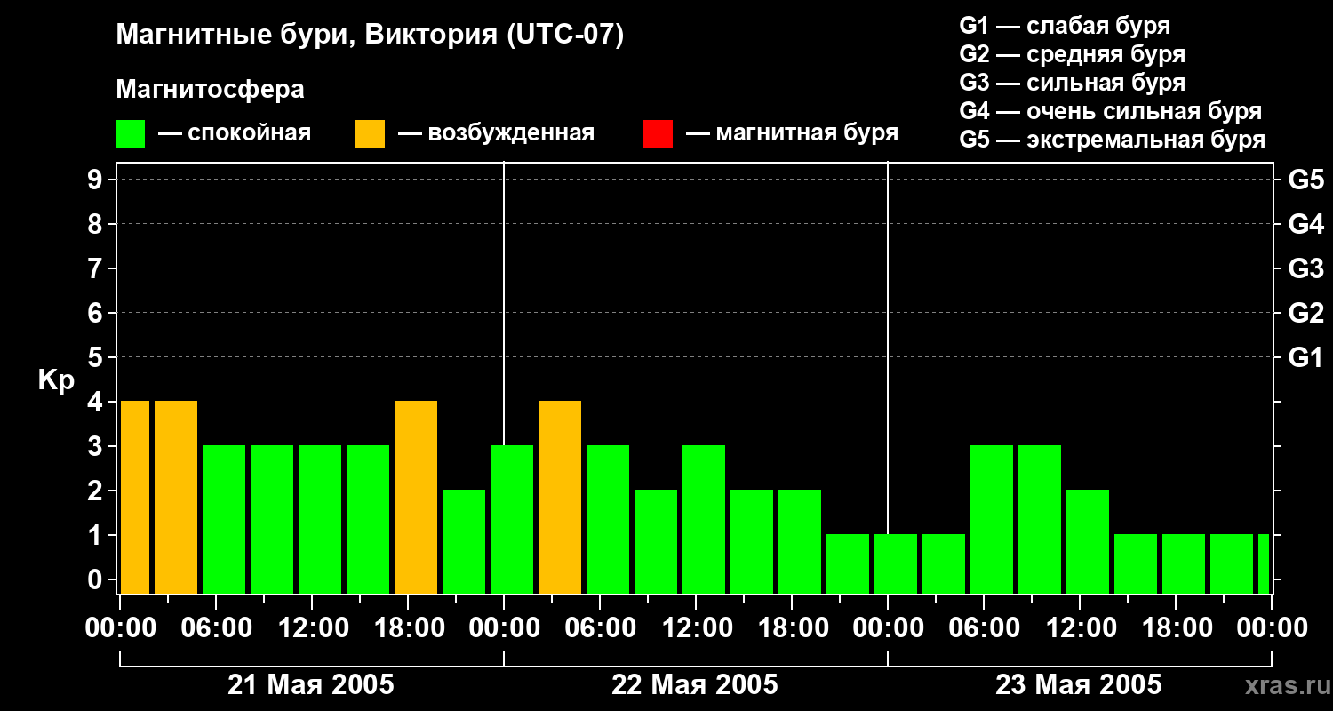 Изменения геомагнитного индекса Kp с 21 по 23 мая 2005 года для средних широт