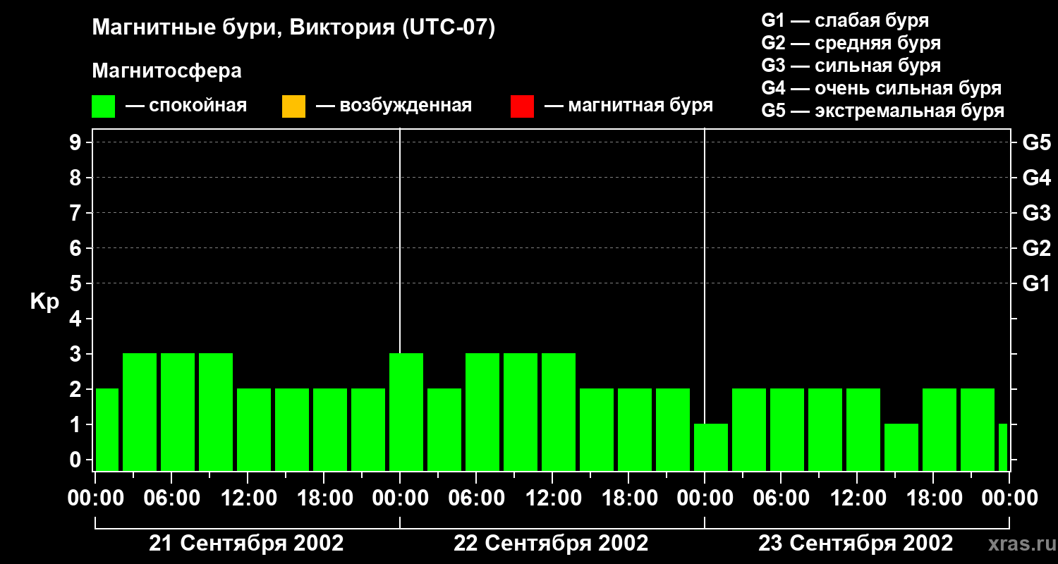 Изменения геомагнитного индекса Kp с 21 по 23 сентября 2002 года для средних широт
