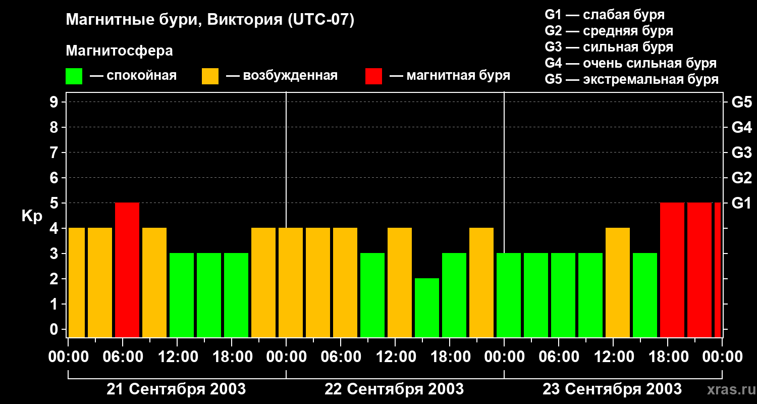 Изменения геомагнитного индекса Kp с 21 по 23 сентября 2003 года для средних широт