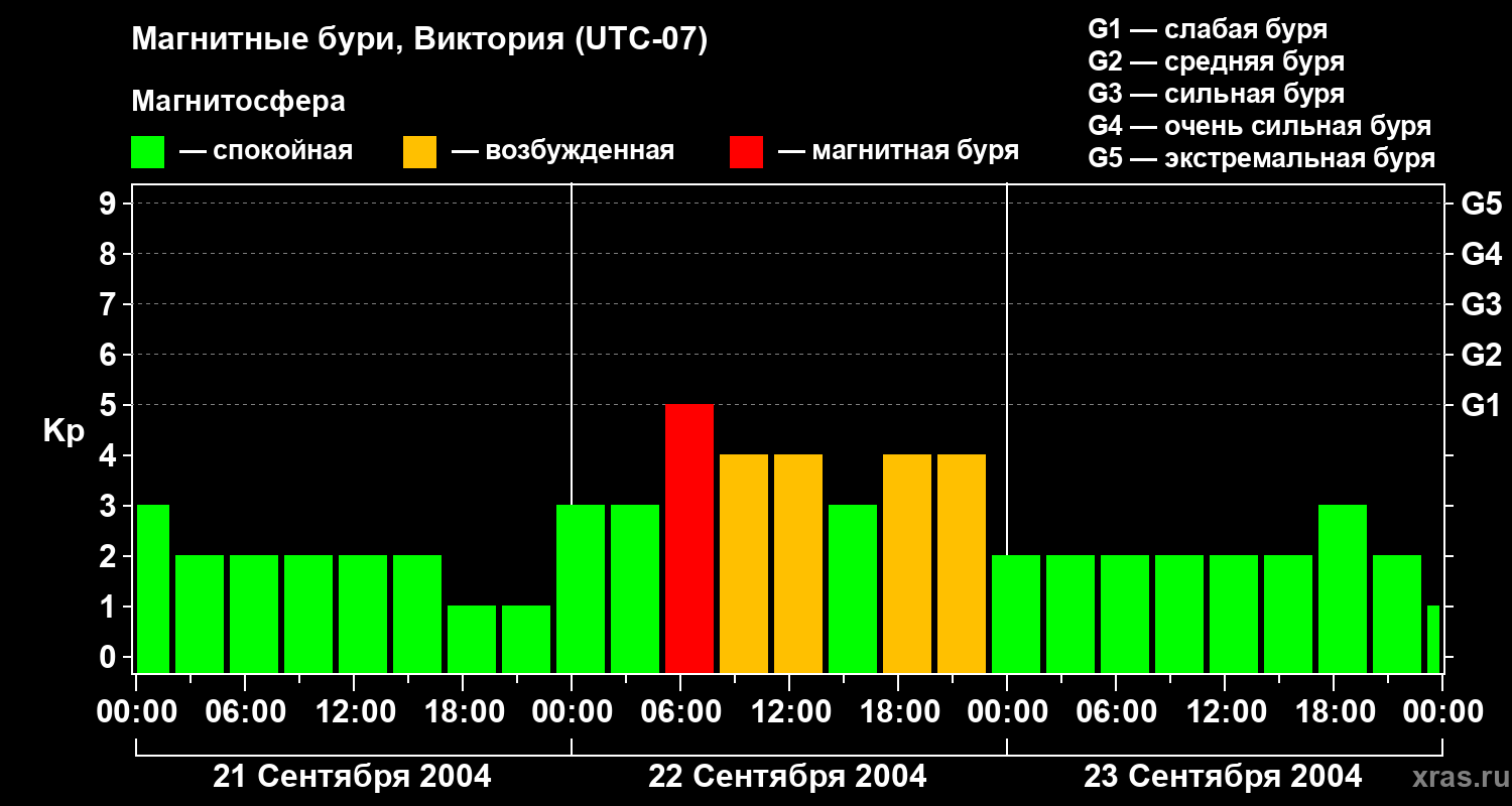 Изменения геомагнитного индекса Kp с 21 по 23 сентября 2004 года для средних широт
