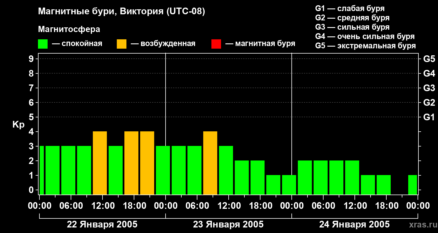 Изменения геомагнитного индекса Kp с 22 по 24 января 2005 года для средних широт