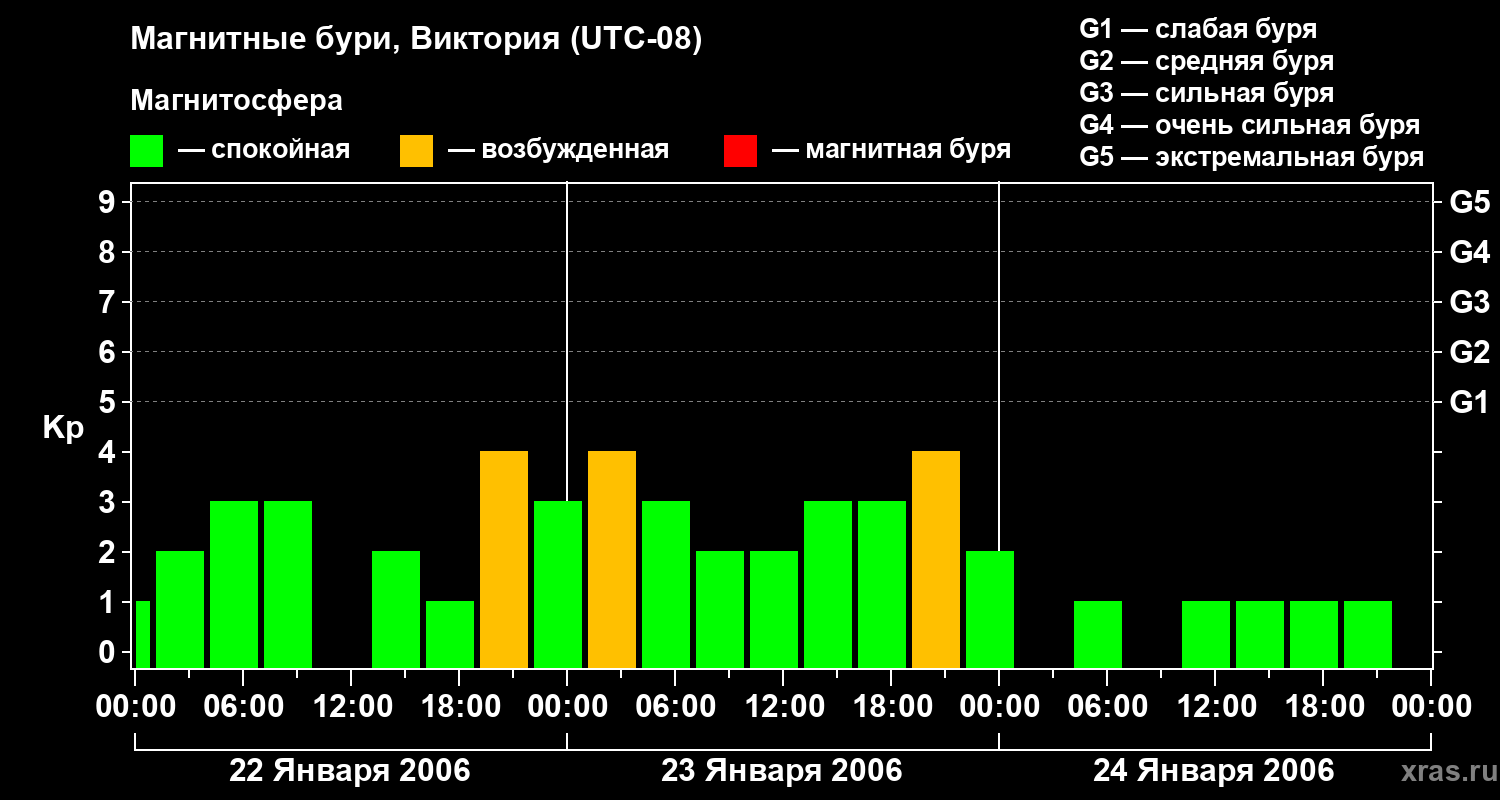Изменения геомагнитного индекса Kp с 22 по 24 января 2006 года для средних широт