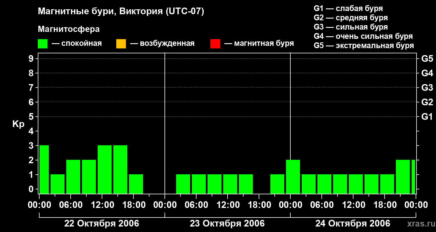 Изменения геомагнитного индекса Kp с 22 по 24 октября 2006 года для средних широт