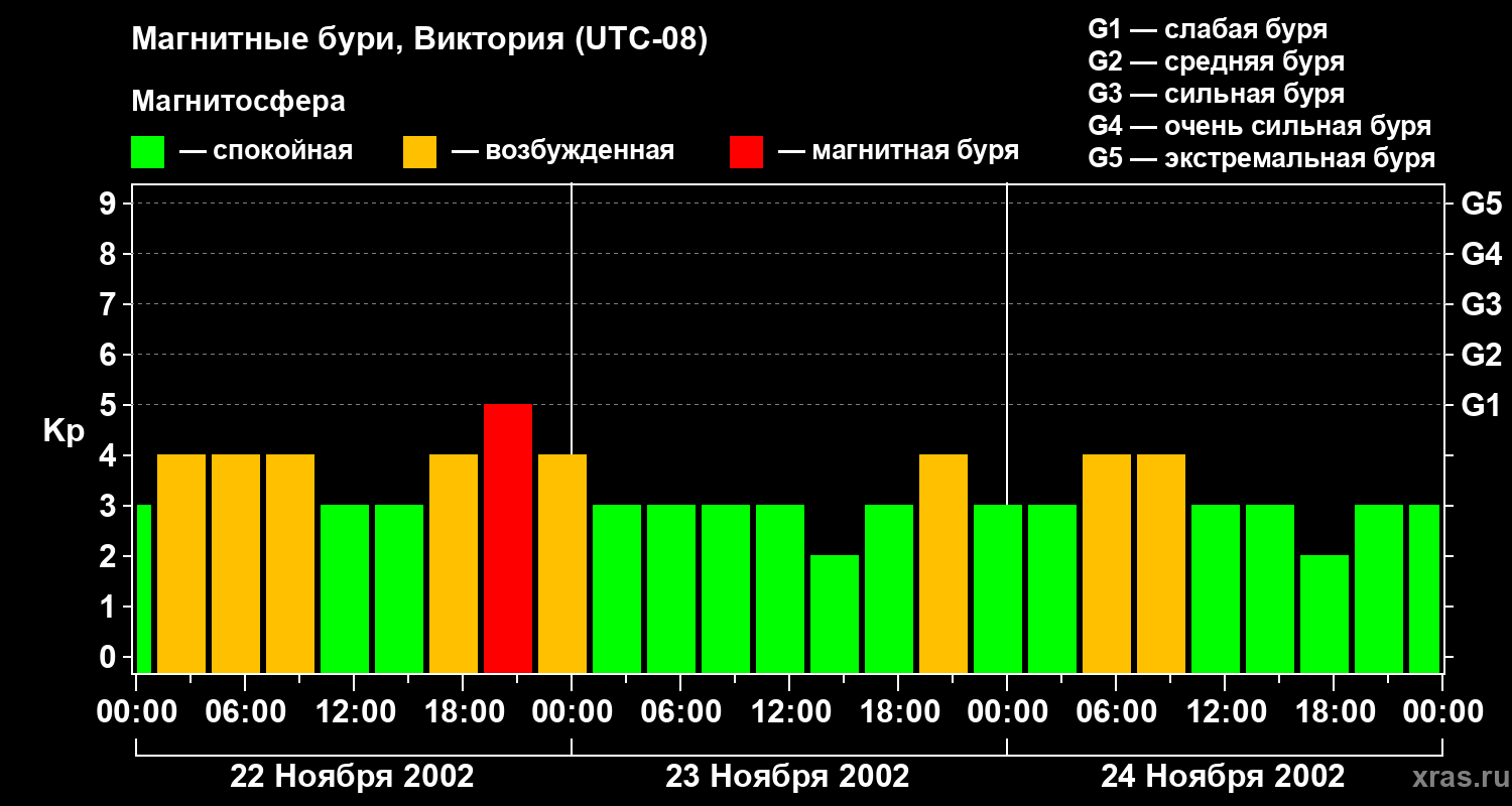 Изменения геомагнитного индекса Kp с 22 по 24 ноября 2002 года для средних широт