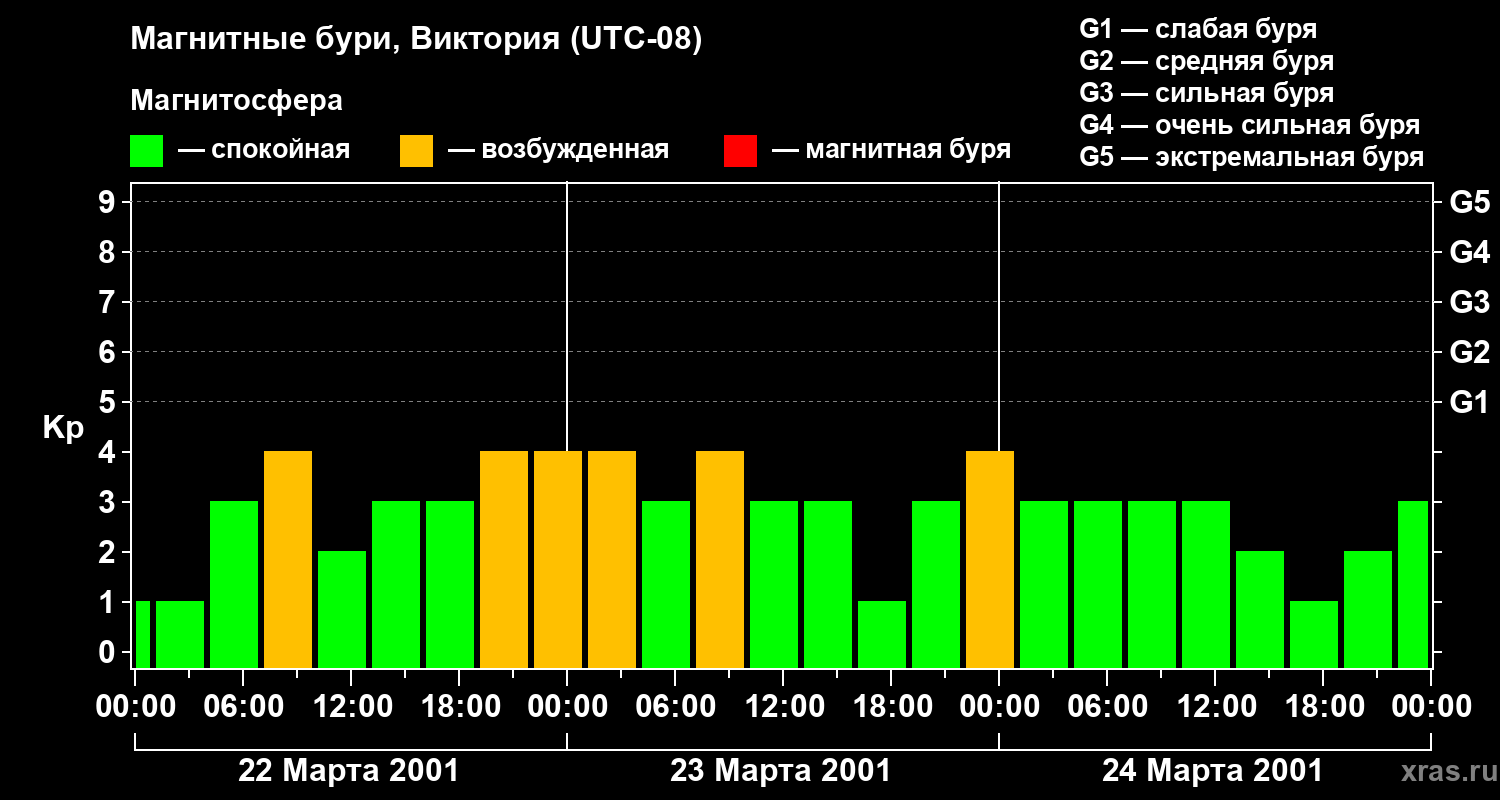 Изменения геомагнитного индекса Kp с 22 по 24 марта 2001 года для средних широт