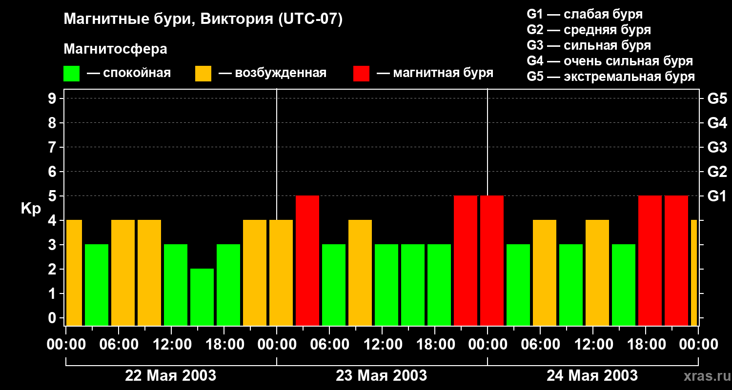 Изменения геомагнитного индекса Kp с 22 по 24 мая 2003 года для средних широт