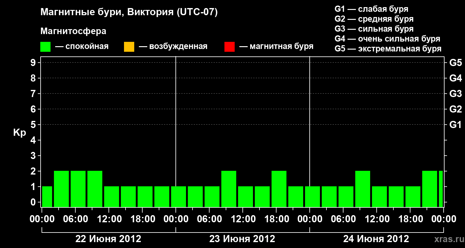 Изменения геомагнитного индекса Kp с 22 по 24 июня 2012 года для средних широт