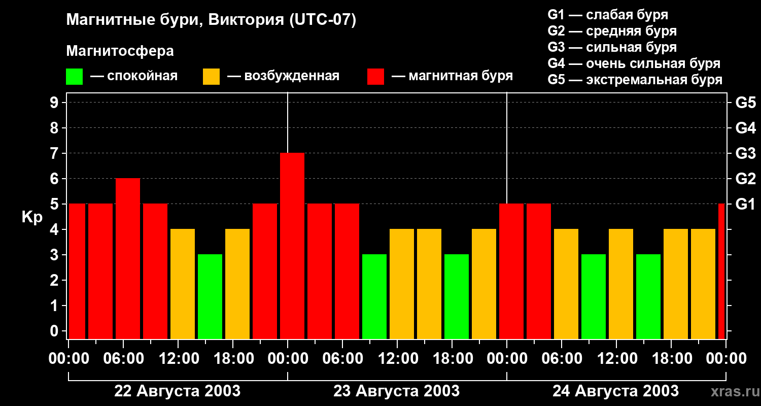 Изменения геомагнитного индекса Kp с 22 по 24 августа 2003 года для средних широт