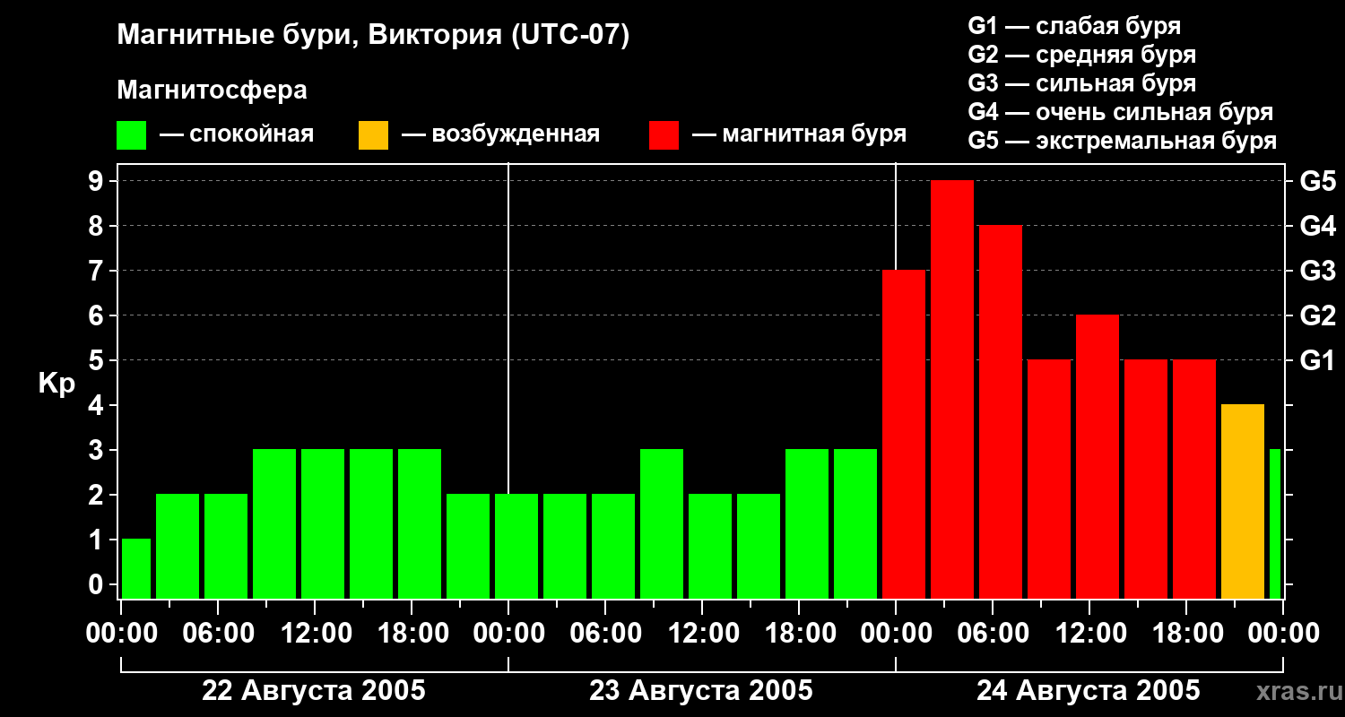 Изменения геомагнитного индекса Kp с 22 по 24 августа 2005 года для средних широт
