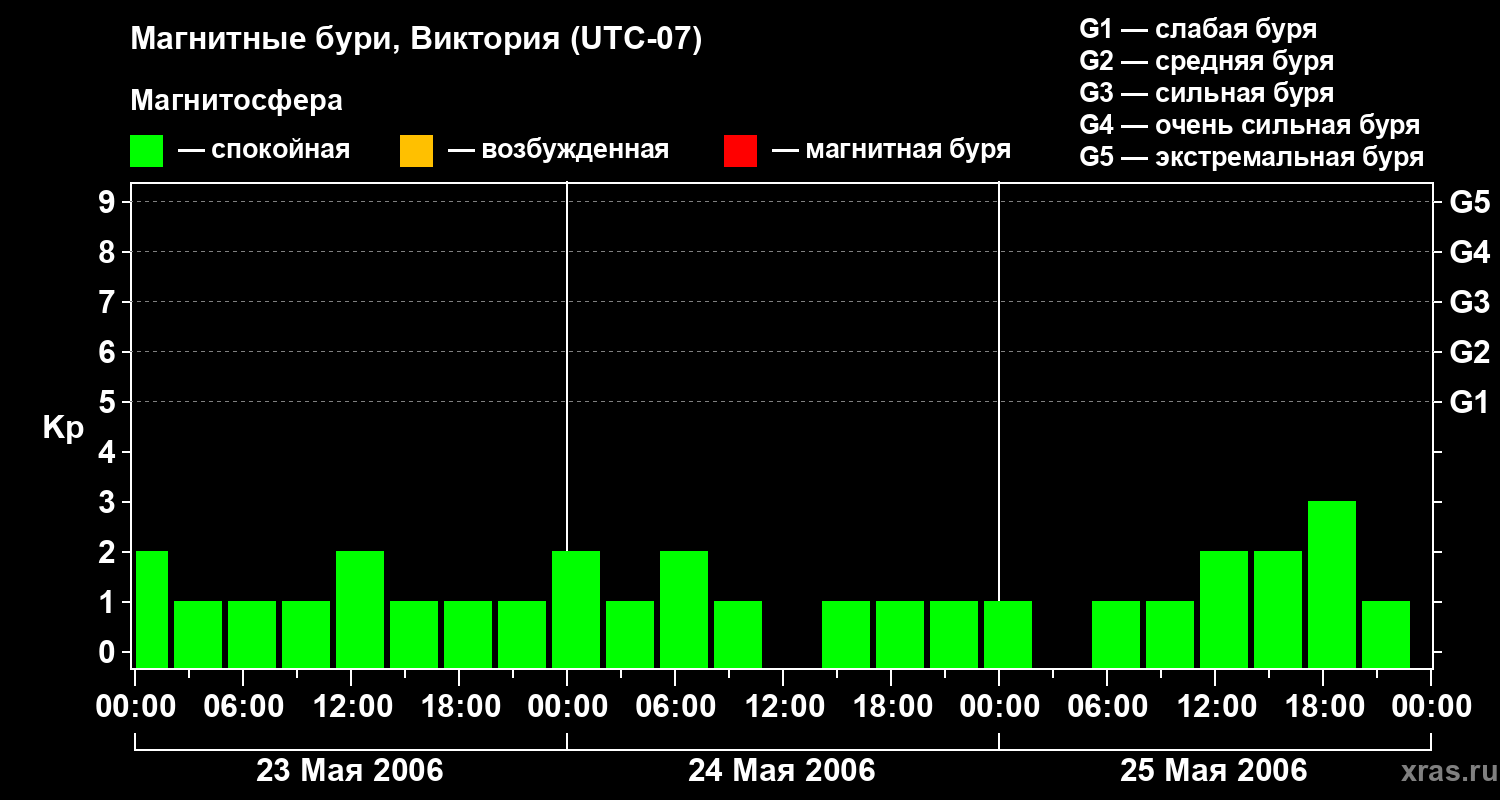 Изменения геомагнитного индекса Kp с 23 по 25 мая 2006 года для средних широт